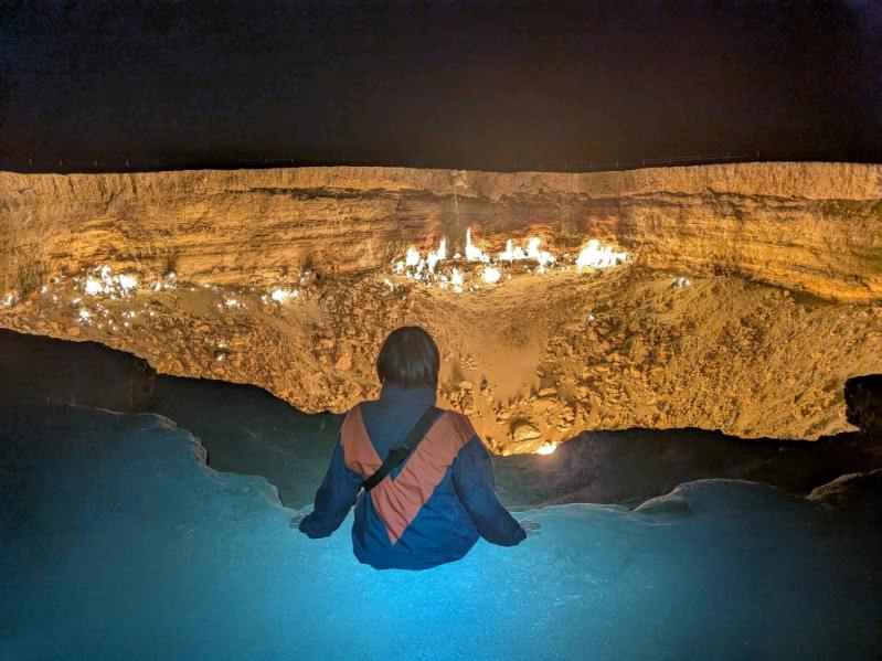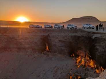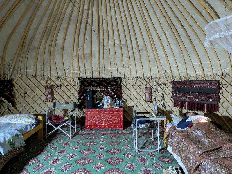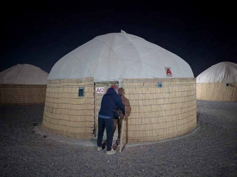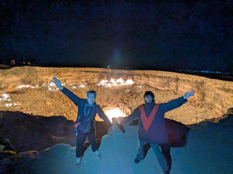 その後4WD5台に分乗しランチ(中華料理)を食べ、レメク・ハニブ廟、スルタン・タケシュ廟、クトルグ・チムール・ミナレット等を観光し、既に道路とは呼べない穴ばかり空いている悪路をアクロバットに避けながら一路”地獄の門”を目指し度々片手運転140キロのスピードで疾走。予定では5時間、我々は1号車であと1時間位というところで4号車5号車が来ず、携帯も繋がらず理由も分からないまま暗闇と蛾が飛び交う中45分待機、後で聞いたらパンク修理をして時間ロスと。ようやく5台揃って地獄の門に到着したのは10時過ぎでした。その後”海の家”のようなバラックでバイキングの夕飯をさっさと食べ、テント泊の予定がモンゴルのゲルのような2人用”ユルタ”に宿泊(トイレ外)。寝る準備をして、寒さ対策とヘッドランプを装着し真っ暗闇の中二人で歩いて5-6分の地獄の門を再訪、まだそこそこ観光客もいて・・・。往時ほど炎・火焔はないものの暗闇の中迫力満点でした。H J N R S ㉒ ㉔ ㉕ ㉖