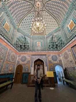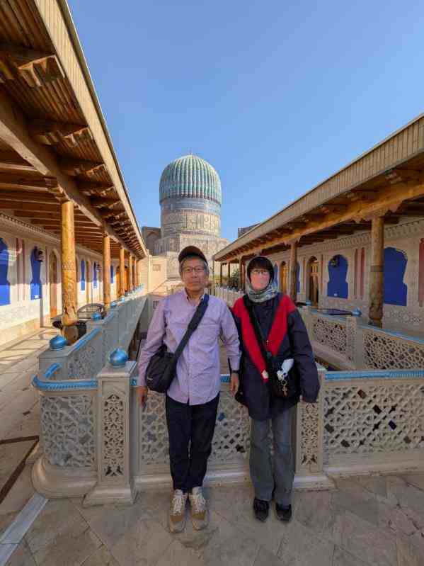 いよいよ最終日、朝グリ・アミール廟を入場観光、その後朝のレギスタン広場を再訪(人も少なくゆっくり観光できたが、店や博物館オープン前(途中でオープン)でした)し、景色の良いチャイ・ハナでティータイム。バザールやその傍のビビハニ・モスクにも入り、その後シャーヒズィンダ廟群を見学。レストランで昼食を取り一路タシケントに向かうも途中大きな交通事故に遭遇、1時間近く渋滞するも何とか夕飯の時間を確保、最後のビールを飲んでタシケントの空港に到着(空港のレストランでホント最後のビール、旨かった、)。成田行きは定刻に出発、機内でそこそこ熟睡、予定通り成田空港に到着し、このツアーもThe