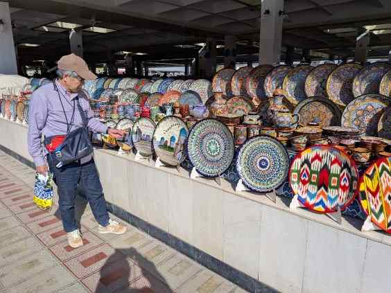 今日はなんとなんと4時出発、約5時間で国境に到着、その前に弁当を食べ仮眠を取り。車内で税関用紙にサインしてスーツケースを引き摺り出国審査を受ける。パスポートチェック、荷物のX線検査(なぜあんなに検査台が高いのか持ち上げるのが大変だろう怒)をして中立地帯行で1人1ドル払いボロボロ音楽爆音のバス乗り、また歩いて2−3分でウズベキスタンの入国審査を受け荷物のX線検査を受けまた5-6分スーツケースを引き摺りながら歩き、またあのいい加減な現地ガイドと合流し昼食のレストランへ直行。その後世界遺産『ザラフシャン・カラクム回廊』を観光(ラボディ・マリク・サルドバ、キャラバン・サライ、ミル・サイード・バフロム廟)しホテルにチェックイン。暗くなってからレストランで夕食後、ライトアップされたレギスタン広場を観光。あまりの人の多さに唖然を通り越して(13年前とは様変わり、どこもオーバーツーリズム!)・・・・・。プロジェクションマッピングをスキップし我々ともう一人は『て』のT-シャツの店”セーブル”へタクシーで行き、ひと悶着あったものの何とかお目当てのT-シャツ等をゲット。因みにウズベキスタンの『7』は日本の『て』と同じで東京オリンピックでウズベキスタン代表が着て日本でちょっと話題になったとか。 66 67 71 72